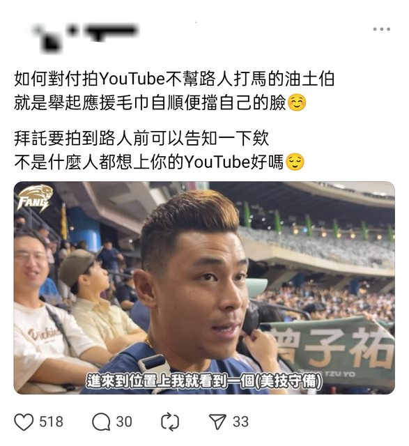 推 yankult0445d: 好像很多台灣yt都不會碼路人臉 不想被拍到就跟他講 09/29 14:53