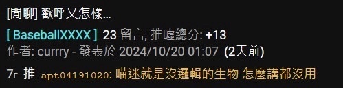 → apt04191020: 還不是學你們的 都被噴了 有時候不回一下怎麼行 10/22 09:56