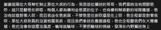 謝謝這兩位大哥幫忙制止那位大叔的行為,我是這位獅迷的哥哥,我們當時沒有想跟他吵