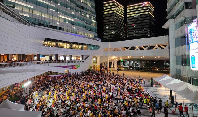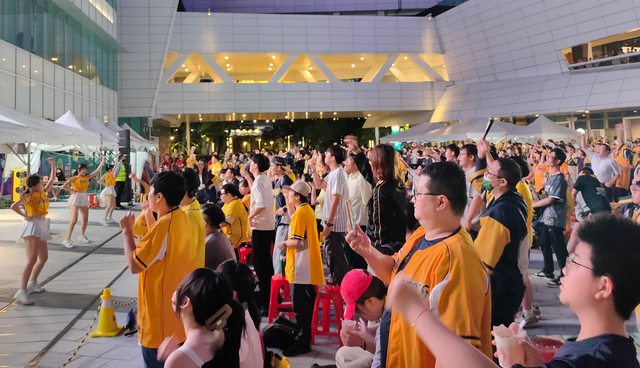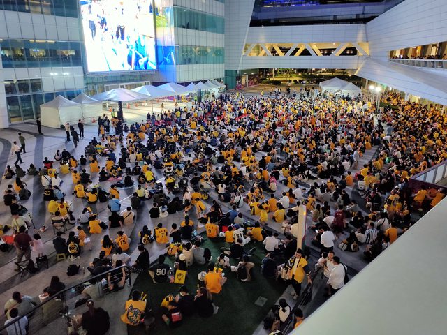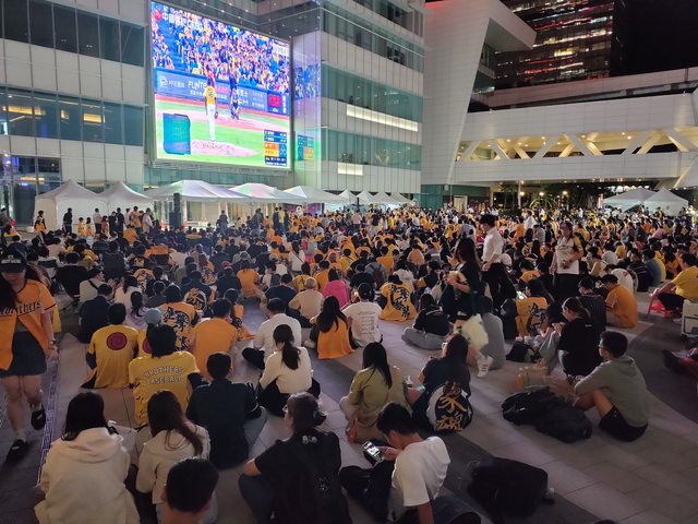 夜晚的中信大樓的廣場燈光繽紛,一個大型螢幕正播放中華職棒總冠軍賽,廣場四周坐滿了拿著加油棒的球迷。