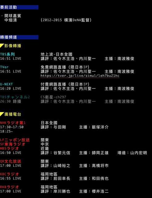 16:50 LIVE 講評:谷繁元信 主播:師岡正雄 場邊:山内宏明