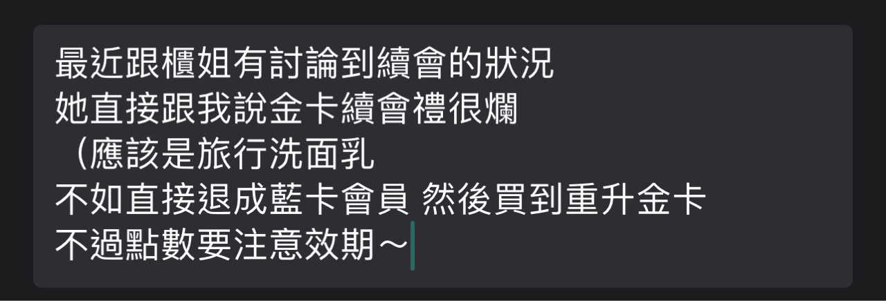 → LeafMay: 不要一次買到金卡會員,入會消費會清空61.227.218.135 09/22 19:48