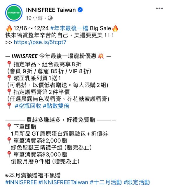 推 Justapig: 今天去innisfree 洗面乳有滿一送一 223.138.29.99 12/16 20:33