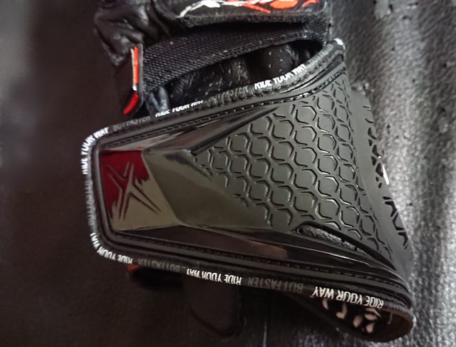 手套側面,很搶眼的大面積手腕保護器。