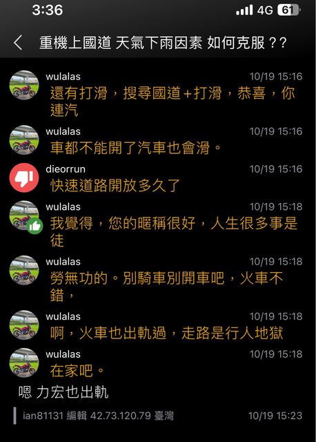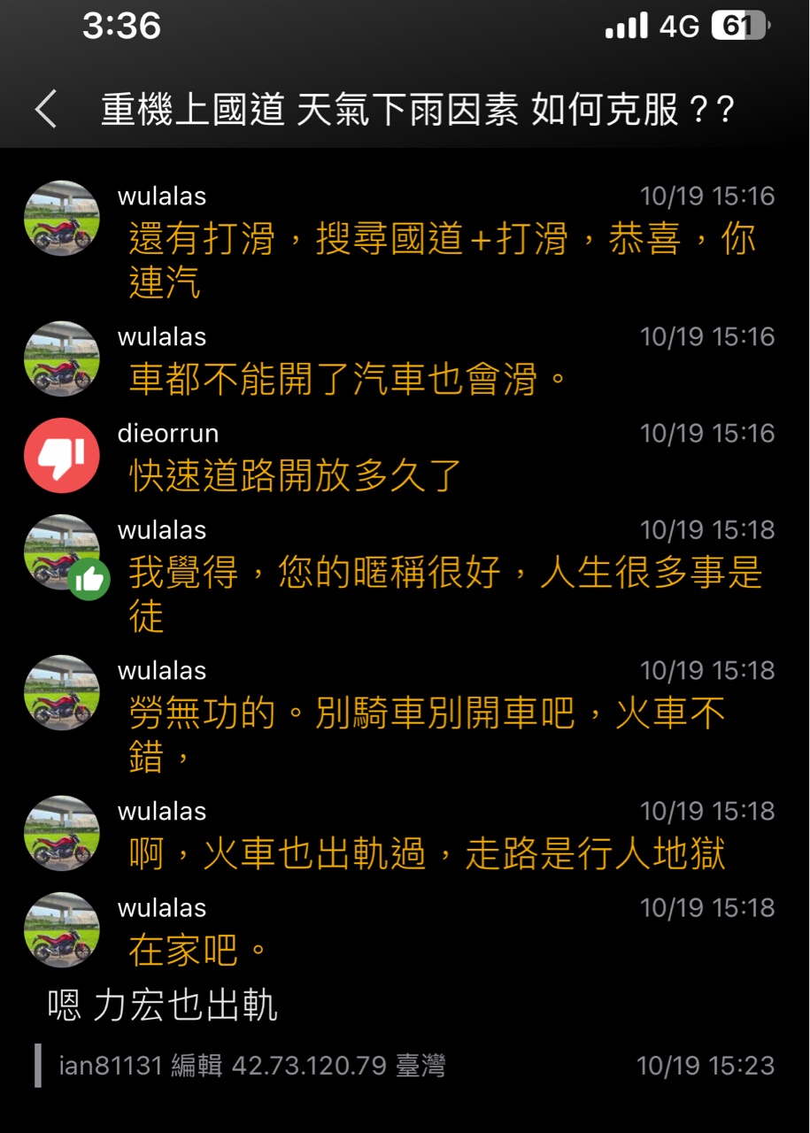 推 podoioco: 之前騎61遇到雨用倒的,照騎啊,回家發112.78.92.106 10/19 14:32