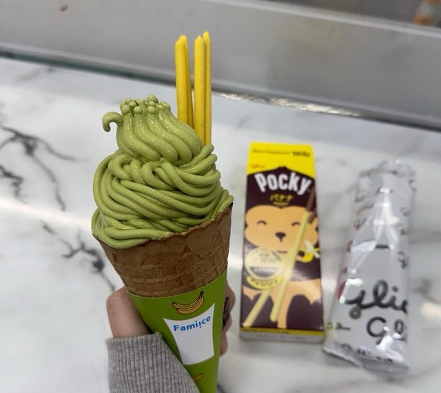 【商品名稱/價格】:靜岡抹茶霜淇淋49元, 10元加購香蕉Pocky棒