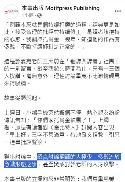 該抱持的心態,我翻譯托爾金十幾年,知道他的作品有多難,不斷持續修訂是正常的。」