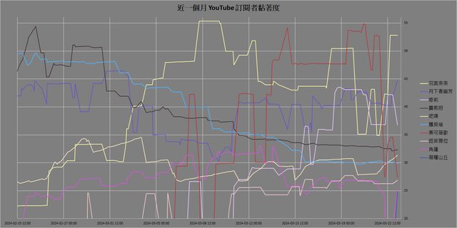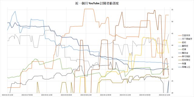 近一個月 YouTube 訂閱者黏著度 [2] 前 10 名: