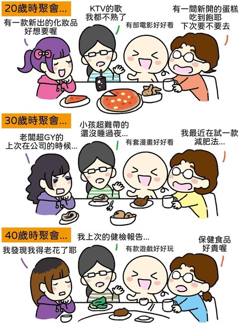 20歲/30歲/40歲時朋友聚會聊天話題 好像還滿寫實的 學生時聊娛樂 剛畢業聊工作 中年聊家庭養生 -- ※ 發信站: 批踢踢實業坊(pttsite.org.tw), 來自: 180.217.42.239 (臺灣) ※ 文章網址: https://pttsite.org.tw/C_Chat/M.1711170773.A.FF2