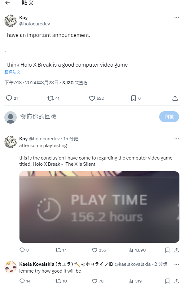 https://twitter.com/holocuredev/status/1771496842041192857 我有重要事項要宣布: Holo X Break是一款好玩的電腦影音遊戲。 https://twitter.com/holocuredev/status/1771497719179235709 https://pbs.twimg.com/media/GJWfhrFbMAAf7qD.png