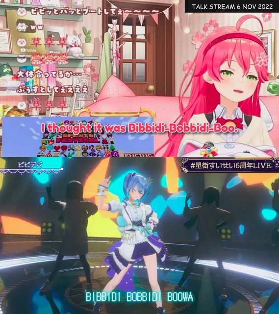 Miko 以前聽到星街的 灼熱にて純情(wii-wii-woo) 時,覺得歌詞太快太難懂,還以為裡面有一句是"Bibbidi Bobbidi Boo",結果根本不是。