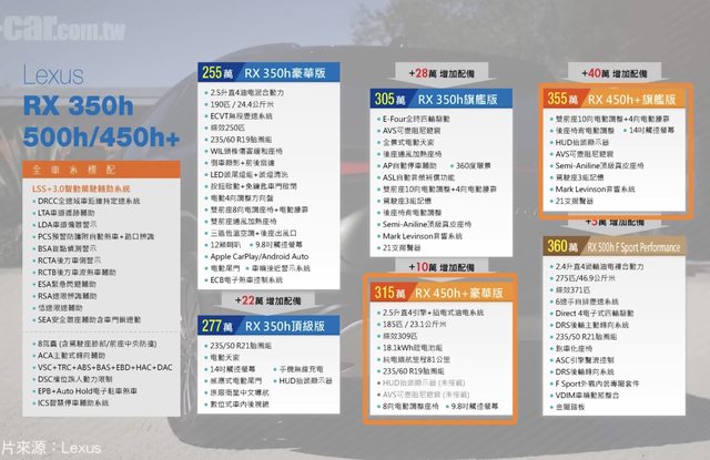 車款型式/排氣量:RX 500h/ 2.4T渦輪油電/ 371匹馬力