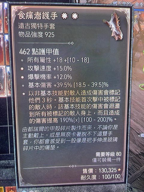 物 品:雙太古 (攻速、爆率)、其餘數值都頂屬,190%食痛者手套