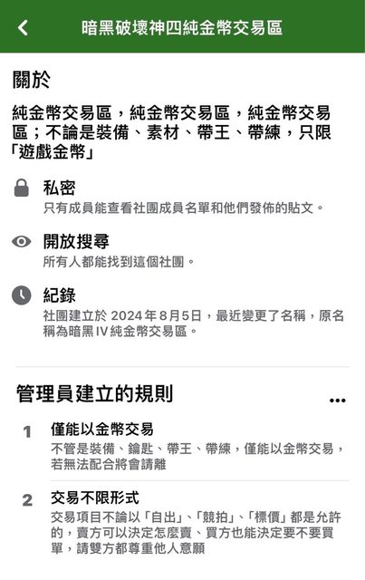 大家好 第五賽季在即,不論好不好玩,從第四賽季開始大家應該都衍生出了交易與金幣的重要性 國外交易網跟巴哈交易板有時候又不是很好用 身為一個不花台幣遊戲的上班族,看了一下FB相關社團,還是很多T幣交易或工作室入駐 這邊想建一個「純金幣交易」的社團,歡迎大家一起加入 目前想到的規則只有兩個 1.不論交易什麼,都只限遊戲金幣 2.交易不限形式,競拍、標價,自出都可以,賣家想怎麼賣都可以,買家也可以選擇要不 要買單,這沒什麼好吵的,大家自由選擇,不喜歡跳過就是了 除非官方開放交易所,不然還是希望有個乾淨的金幣交易區 另有開啟匿名發文功能 其他還沒想到如果有好的點子也歡迎大家提供 ps.第一次建社團 有什麼改正建議也請不令賜教 https://www.facebook.com/share/g/RVCUsvvZg8dB4w9q/?mibextid=K35XfP https://i.imgur.com/gJSTZBR.jpeg