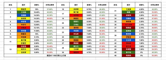 一、以下是本隊超過100打席球員的數據