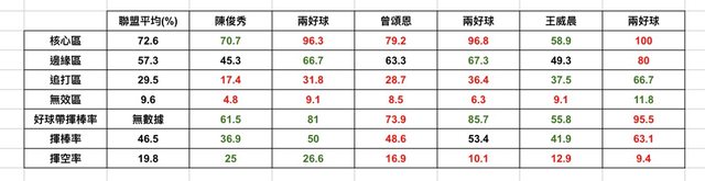 我去查了他兩好球時各區域的出棒率,