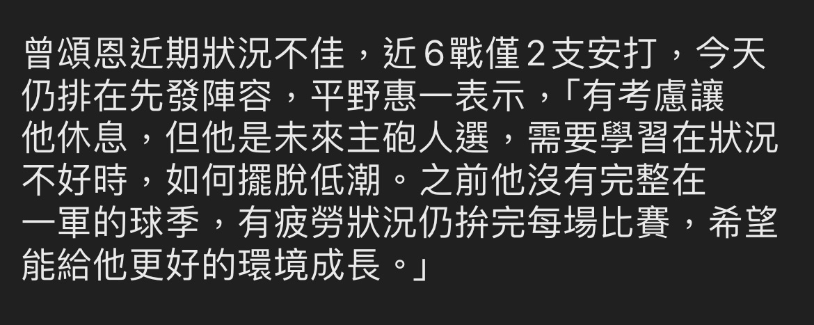 推 ennui: 看新聞,平野是希望魚住持續上場去突破低潮和體力臨界點, 07/07 16:44