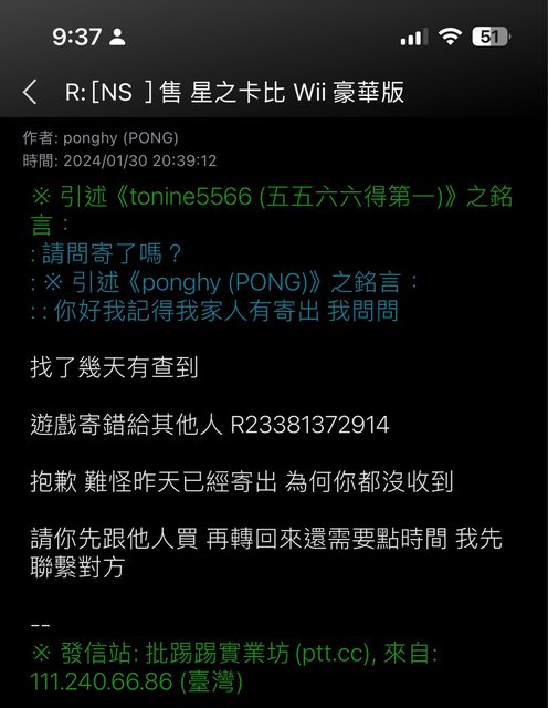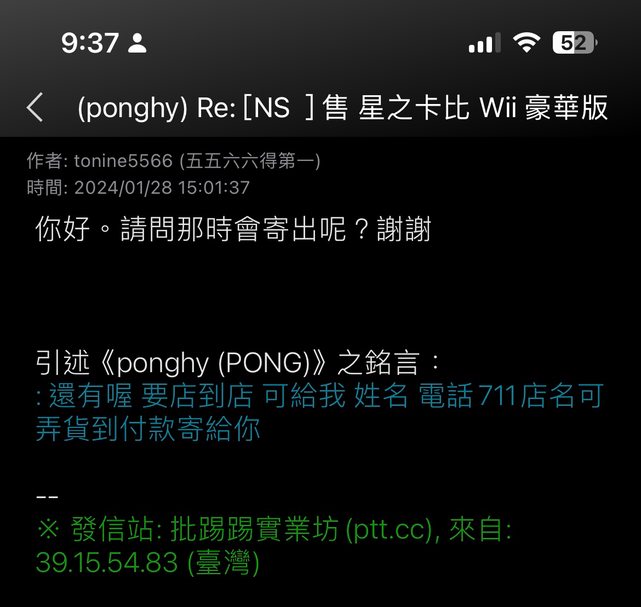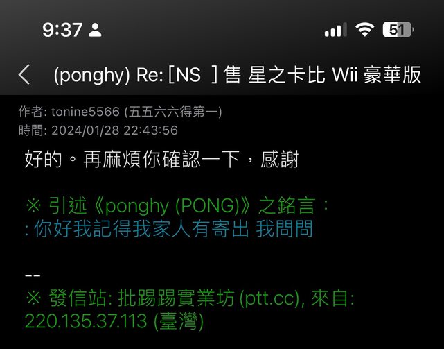 1/26 站內信詢問ponghy 星之卡比WII是否仍可購買,並表示想購買,對方隨即回信詢問