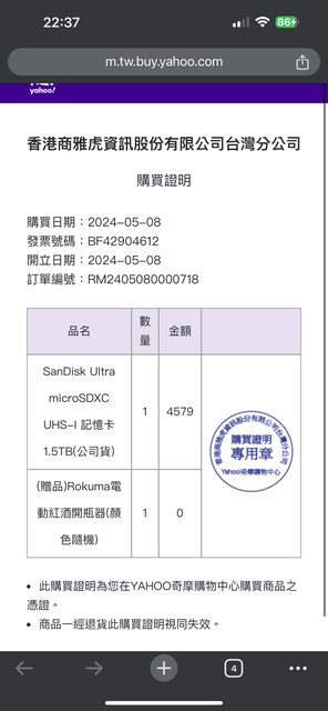4:今年5月8日於Y購 購入,使用正,會給購證,換2T故售出