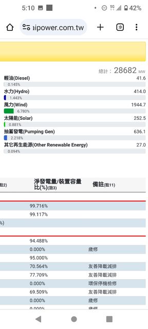今天的風力發電來到1944.7MW,占比6.78%,是我看過最高的一次發電量,超越核電的189