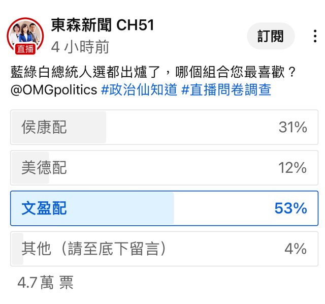 → cvnn: 看來柯讓10.96% 還是打趴車輪黨 223.136.65.209 11/24 21:10