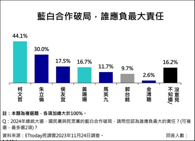 : 、柯文哲26%。另外,調查結果也顯示,藍白合破局,認為柯文哲該負最大責任的比例高