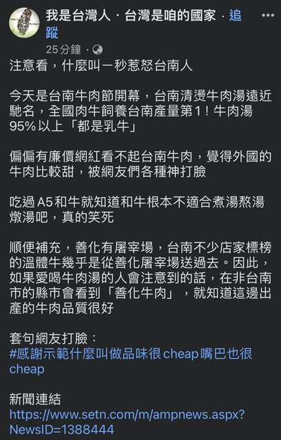 → Leo4891: 台南人硬要嘴乳牛屌打肉牛就是自卑感作祟 36.231.8.208 11/26 17:16