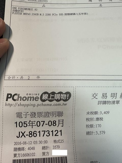 ◎硬體型號: 1.Plextor 256M8PeG 256GB M.2 SSD 一個 已售出