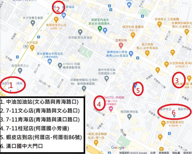 請參考圖片中的6個紅圈地點