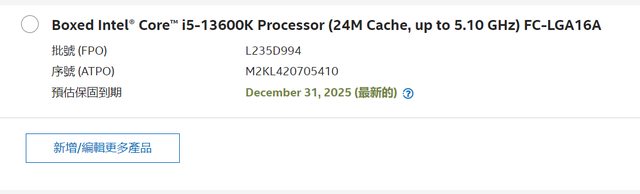 INTEL 官網保固到期日預估 December 31, 2025