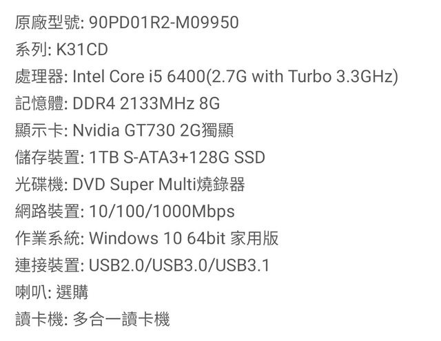 ◎硬體型號: ASUS K31CD 套裝電腦主機