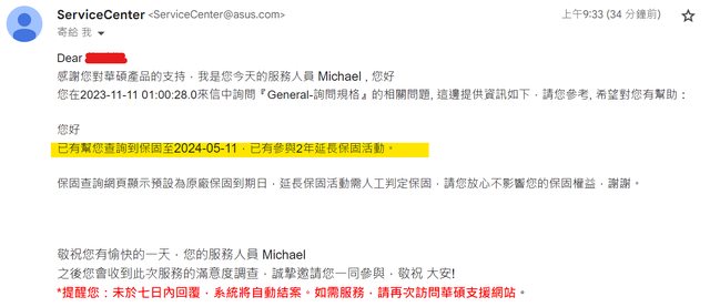 以下是詢問華碩客服保固日期之回答