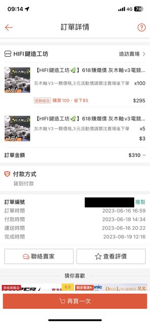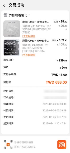 2. FL980炸蝦粒三件套、PC定、POM定皆為2023/2月於淘寶購入,無保固,功能都正常,目
