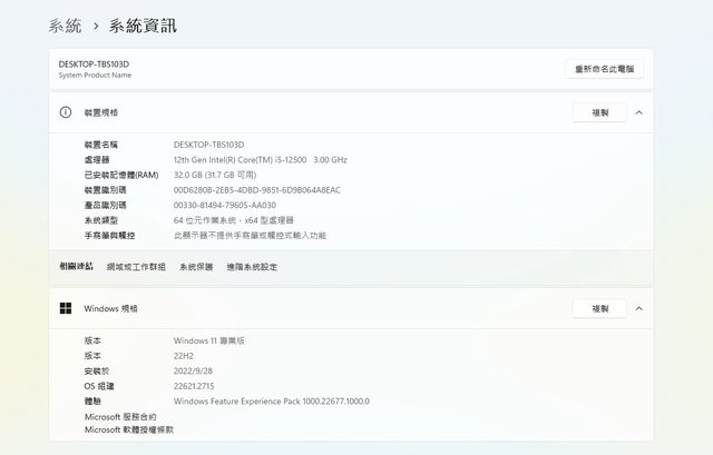 ◎硬體型號: CPU:i5-12500 MB:ROG-B660A-WIFI RAM:Kingston FURY DDR3200 16G BEAS