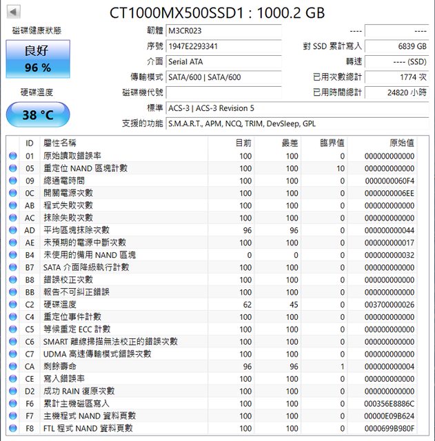 ◎硬體型號: MX500 1TB SATA SSD