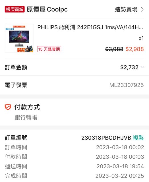 2. 2023/3於原價屋蝦皮官方旗艦店購入全新品,保固三年至2026/3/21,盒裝完整,另包
