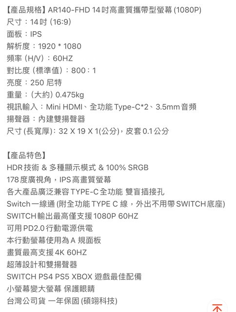 ◎硬體型號:Arzopa A1 14寸 1080P FHD 60Hz 可攜式螢幕