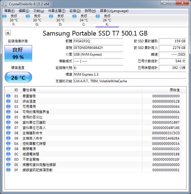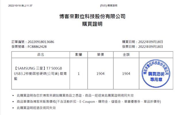 ◎硬體型號: SAMSUNG三星移動式外接固態硬碟T7/500GB/M.2/USB3.2
