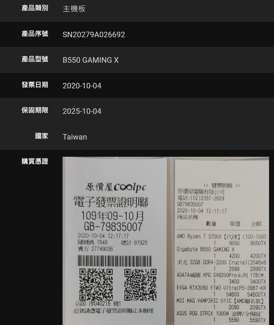 1. CPU: 2022/02/25 購買、MB: 2020/10/07 購買(五年保) CPU有盒有風扇(未使用)、MB無盒 有擋板 配件不確定 2. 過保,已掃過無壞軌 3. 過保,使用皆正常換下,包含防塵網。後方USB孔稍微接觸不良
