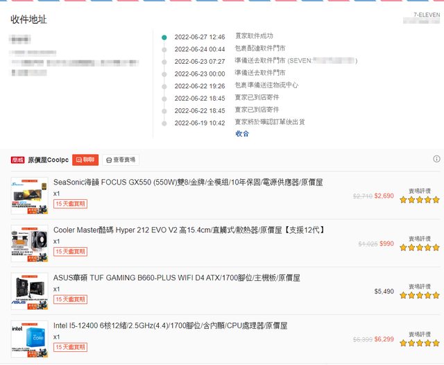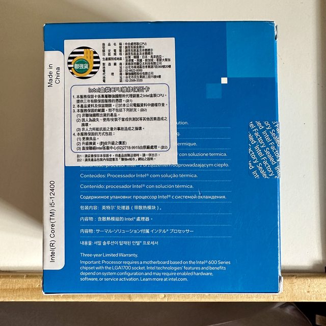 1. a. i5-12400 2022-06-19 原價屋蝦皮下單,2022-06-27 取件安裝 b. i5-12400 聯強貨三年保(原價屋貼紙111.06.25) c. BIOS 預設使用,LR、PS 修圖,威力導演剪片 d. 原廠風扇未使用 2. a. 212EVOV2 2022-06-19 原價屋蝦皮下單,2022-06-27 取件安裝 b. 過保 c. BIOS 預設 Q-Fan d. 僅使用 12700 腳位配件(已用塑膠袋分裝),用一次原廠散熱膏