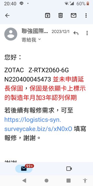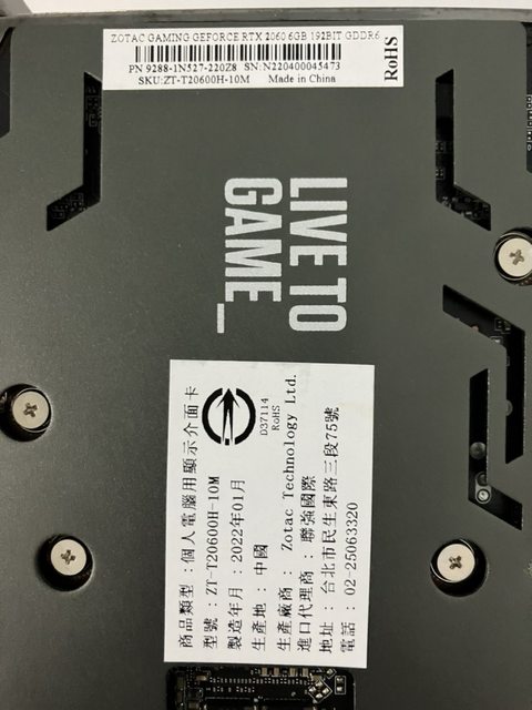 賣 RTX 2060 索泰2060 保固至2025-01 --> 證明請看圖片 ◎欲售價格: 2060 $3300 ◎品樣狀況: 公司升級退下,網上及原價屋取得,無完整盒裝,2060品項9成,一律先匯款後寄貨,可採 取全家或7-11郵寄,郵資60 ◎佐證資料: 2060-索泰 這張卡上有原價屋的購買貼紙但是當時沒有申請保固所以跟原廠確認後只能往後加三年所 以是2022年1月加三年等於2025年1月