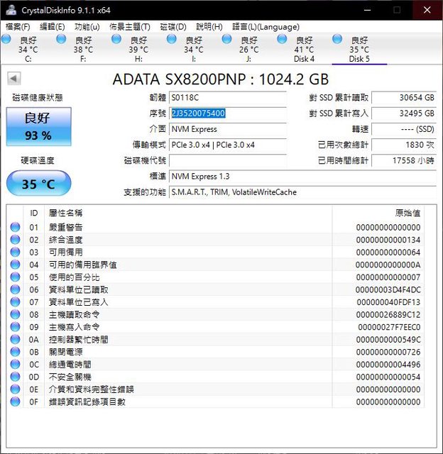 3. ADATA SX8200 Pro 1TB 健康度93%