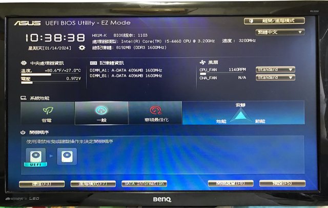 ◎硬體型號: i5-4460,H81M-K,4G DDR3x2,Benq GL2250