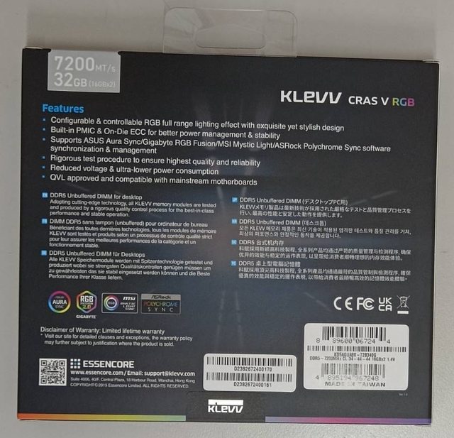 ◎硬體型號: KLEVV 科賦 CRAS V RGB - DDR5 - 32GB(16G*2) - 7200MT/S