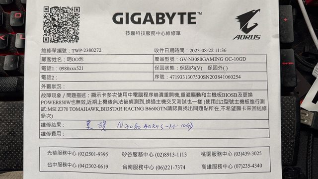 因原卡跟主機板相沖,送修3次都沒用,技嘉升級成AORUS,後續使用正常至2024/04