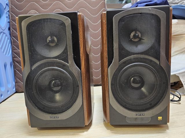 電腦房放音樂用,最近升級換下,喇叭箱體外觀不錯,唯右喇叭網面最上方有一點鉤到(見