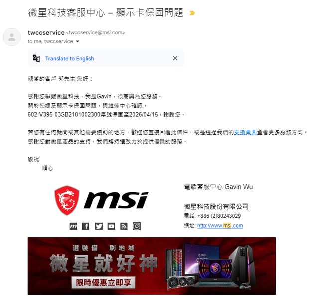 下方mail截圖因為顯卡升級過,所以序號對不上,但保固沿用