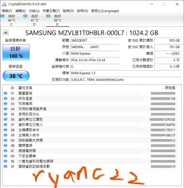 ◎硬體型號: Samsung PM981a MZVLB1T0HBLR-000L7 (Lenovo Thinkpad版本)