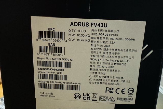 ◎硬體型號:AORUS 螢幕 FV43U