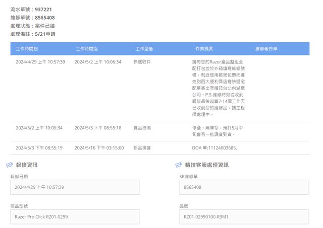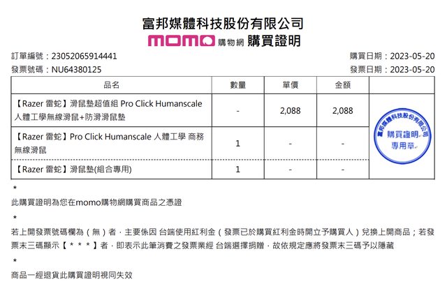 b. 2023/5/20 MOMO購入,保固兩年到2025/5/20,RMA回來未拆封,已購買其他滑鼠替代。